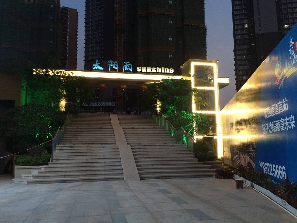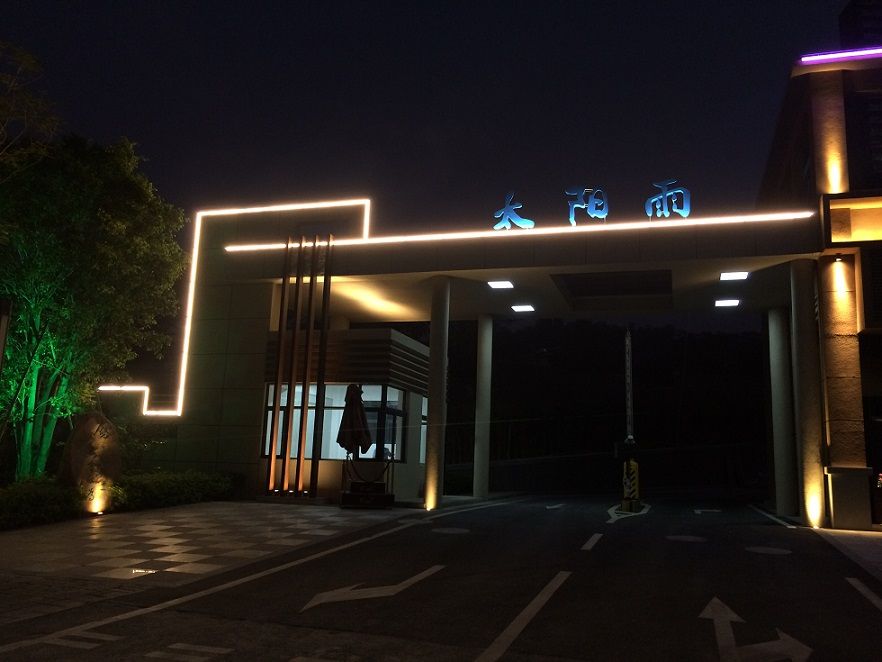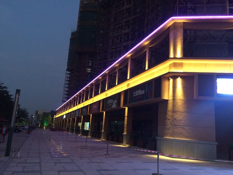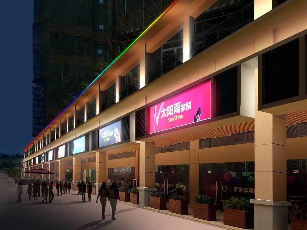 深圳太陽(yáng)雨家園,既滿足對(duì)臨街商業(yè)的功能照明,又通過(guò)彩色跳動(dòng)的燈光營(yíng)造商業(yè)氣氛;小區(qū)入口采用常規(guī)暖光,凸顯宜居溫馨的夜色。